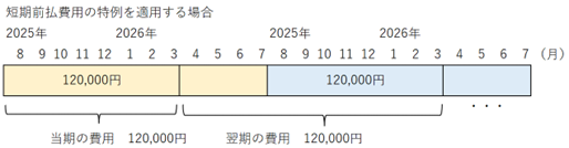 一方、短期前払費用の特例を適用した場合は翌期4~7月分の費用も当期の費用とすることができ、当期の費用が120,000円となります。