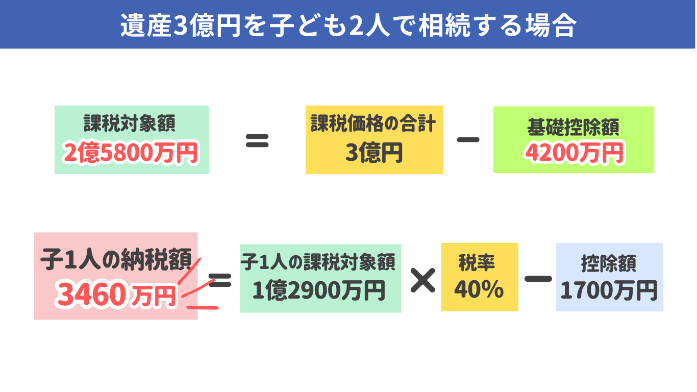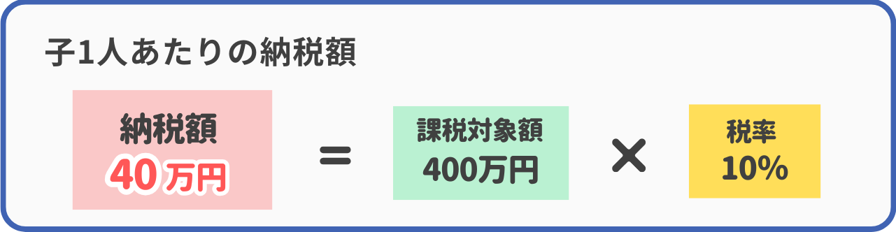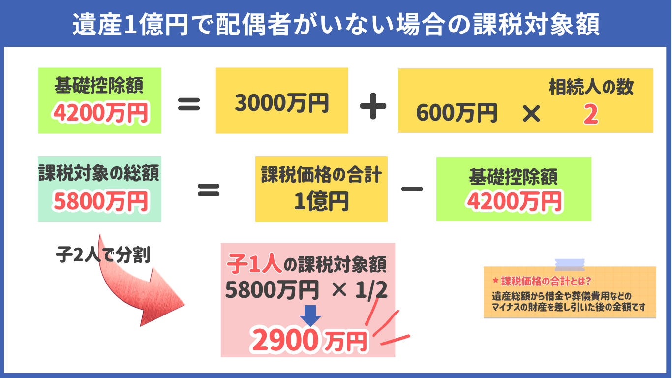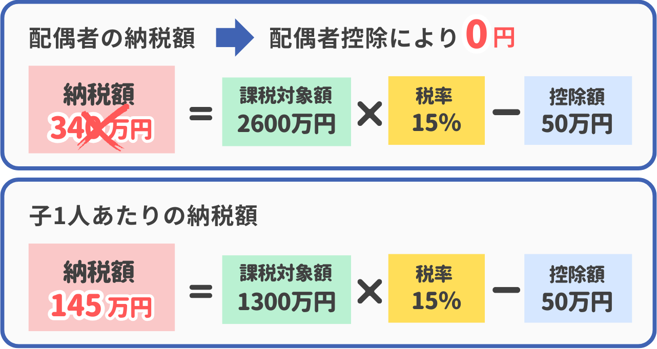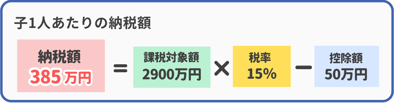 配偶者控除という大きな優遇枠が使えないため、子1人あたりの課税対象額は2,900万円となります。