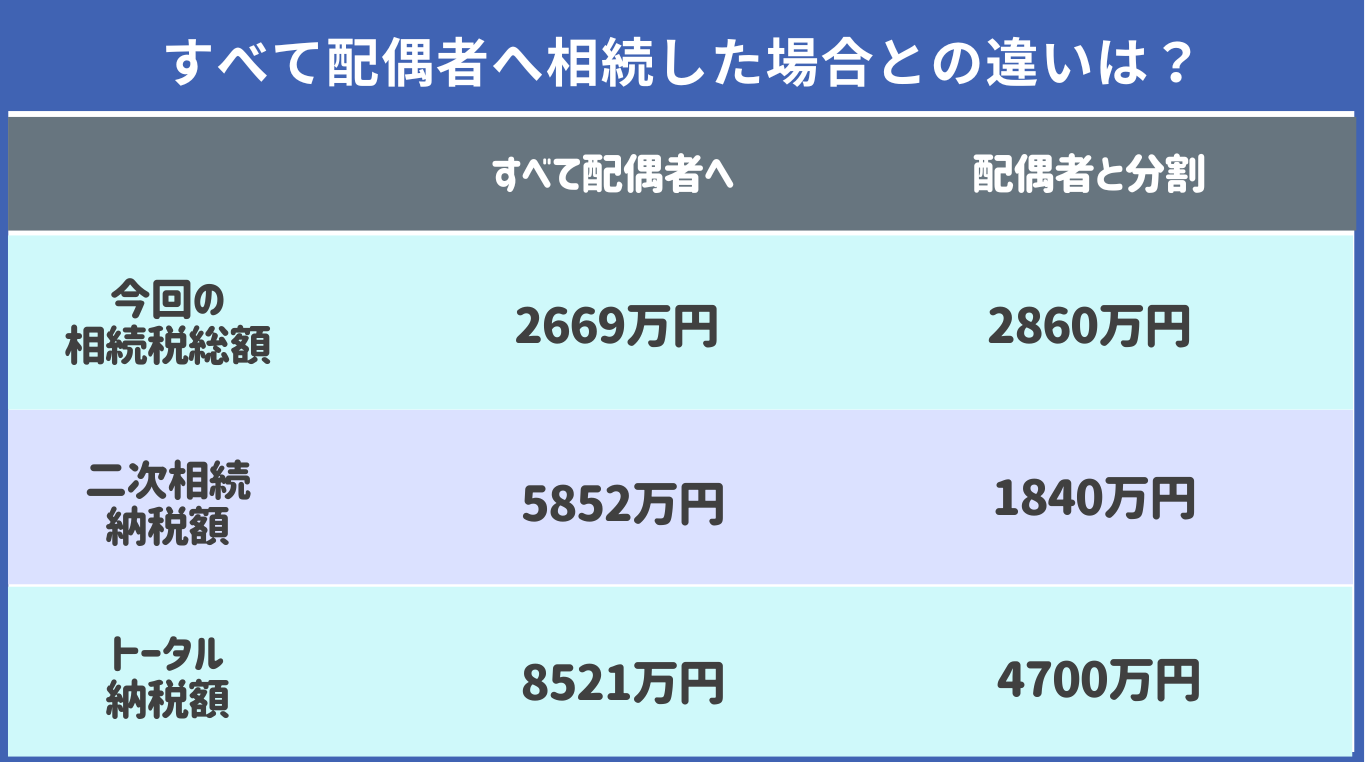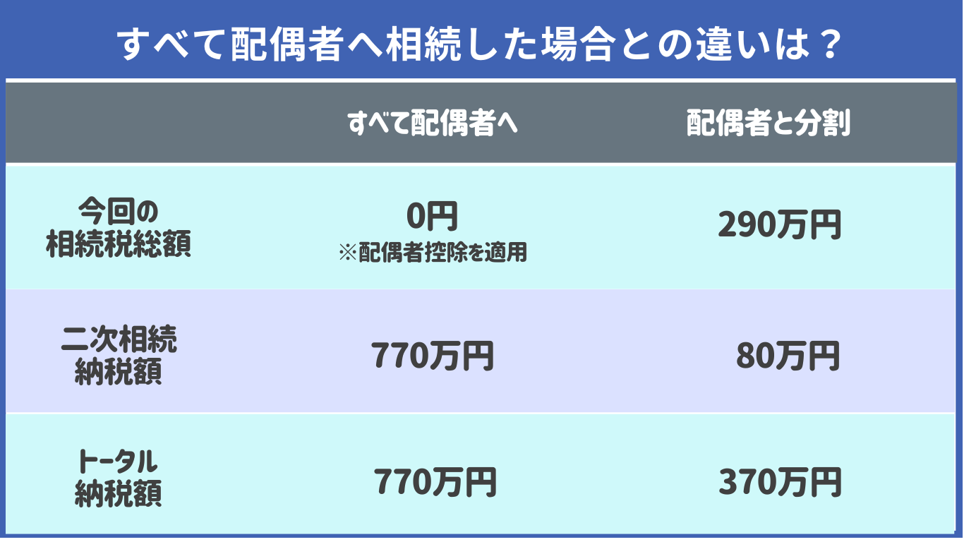 ここで、今回の相続ですべて配偶者が受け取る場合との違いをみてみましょう。