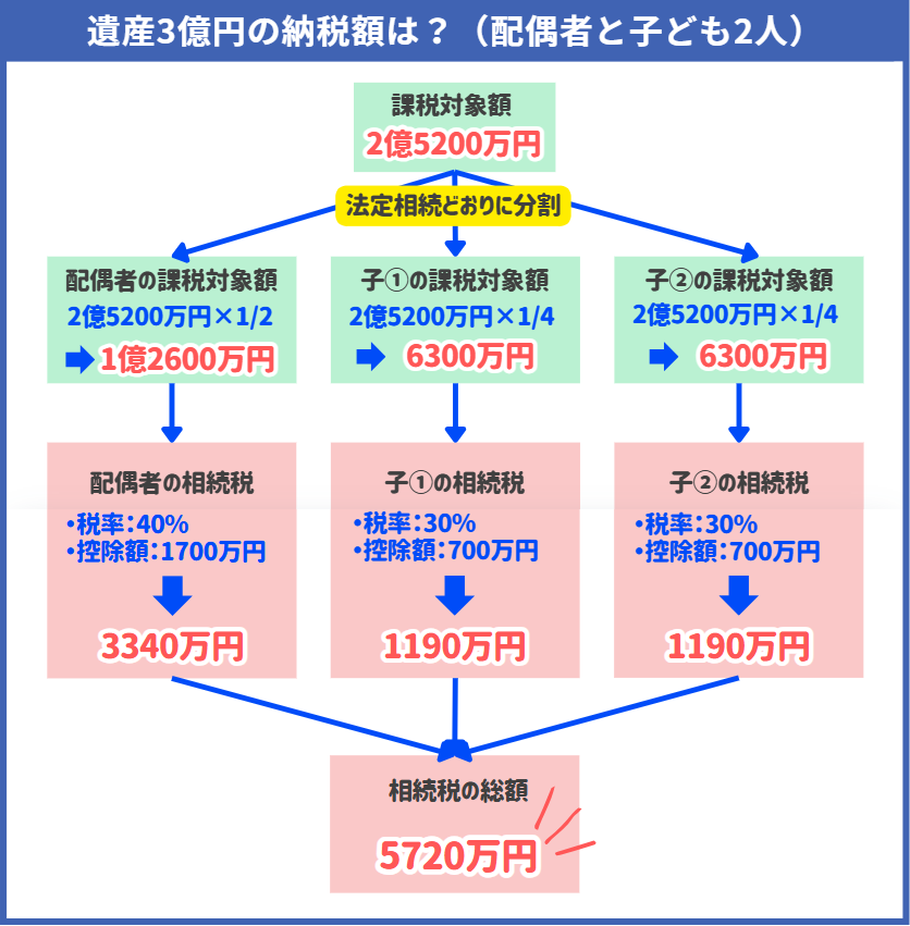 続いて、課税対象額の2億5,200万円を法定相続分で分け、仮の納税額を算出します。