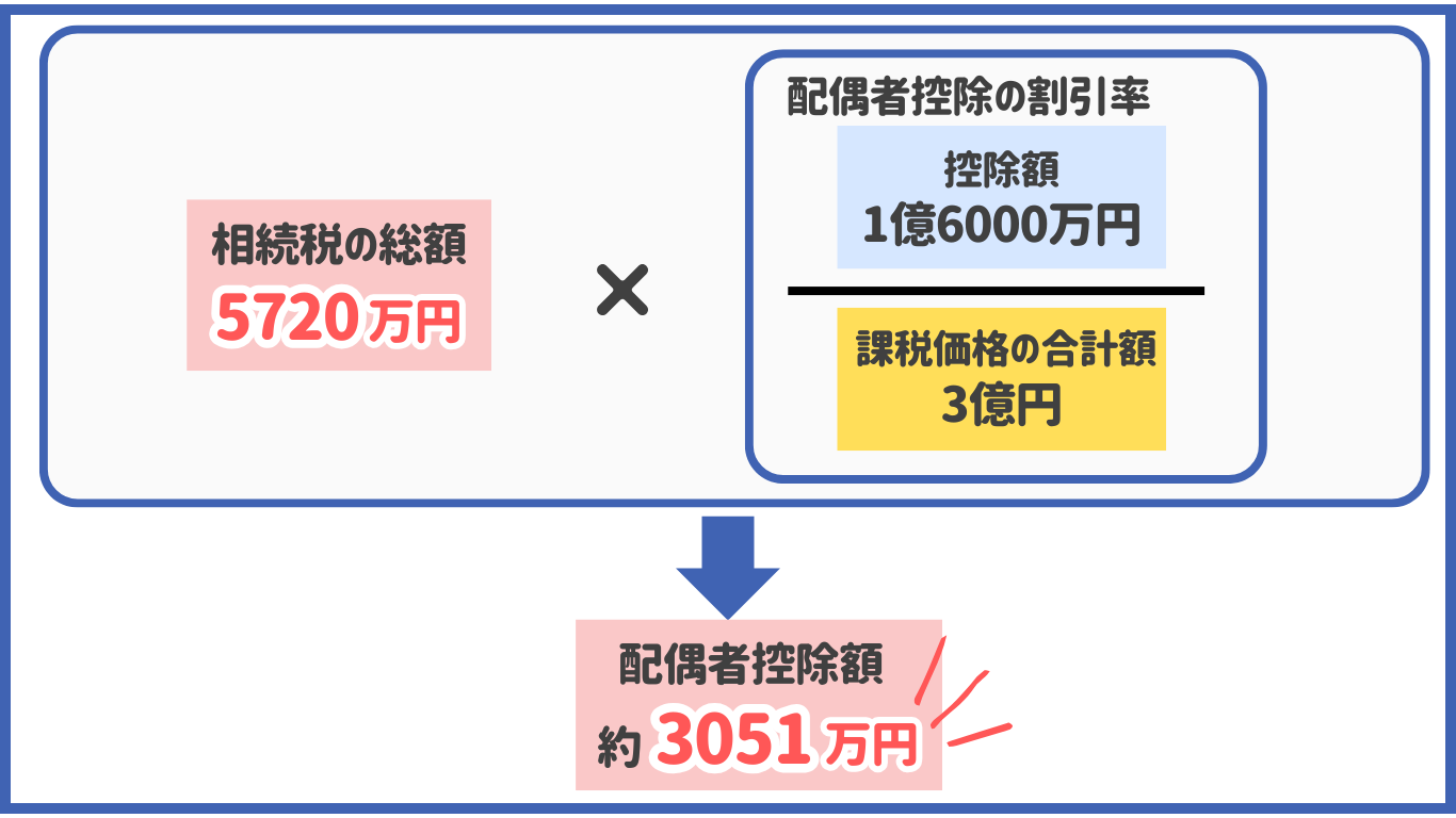そのため、本来納めるべき相続税の総額に配偶者控除の割引率を掛けて「配偶者控除額」を以下のように算出します。