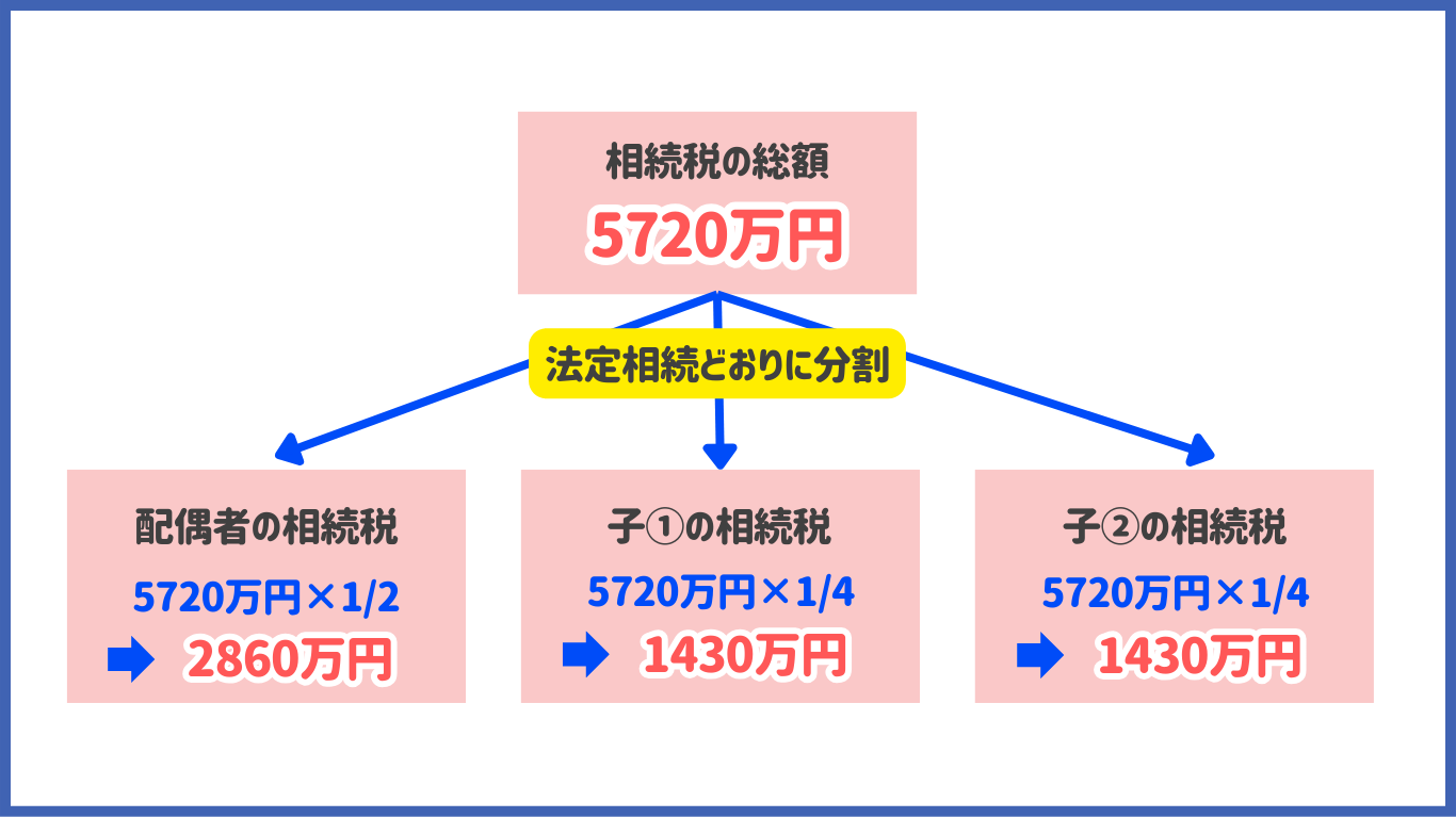 先ほどシミュレーションしたとおり、配偶者と子2人の場合の相続税額は5,720万円 なので、この相続税を配偶者50%、子1人に付き25%で分けると以下のようになります。