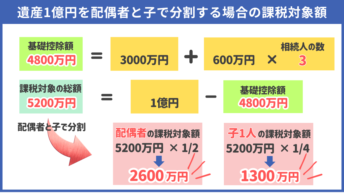 この場合の法定相続人は、配偶者と子2人の3人なので、基礎控除額は4,800万円となり、課税対象額は2億5,200万円です。