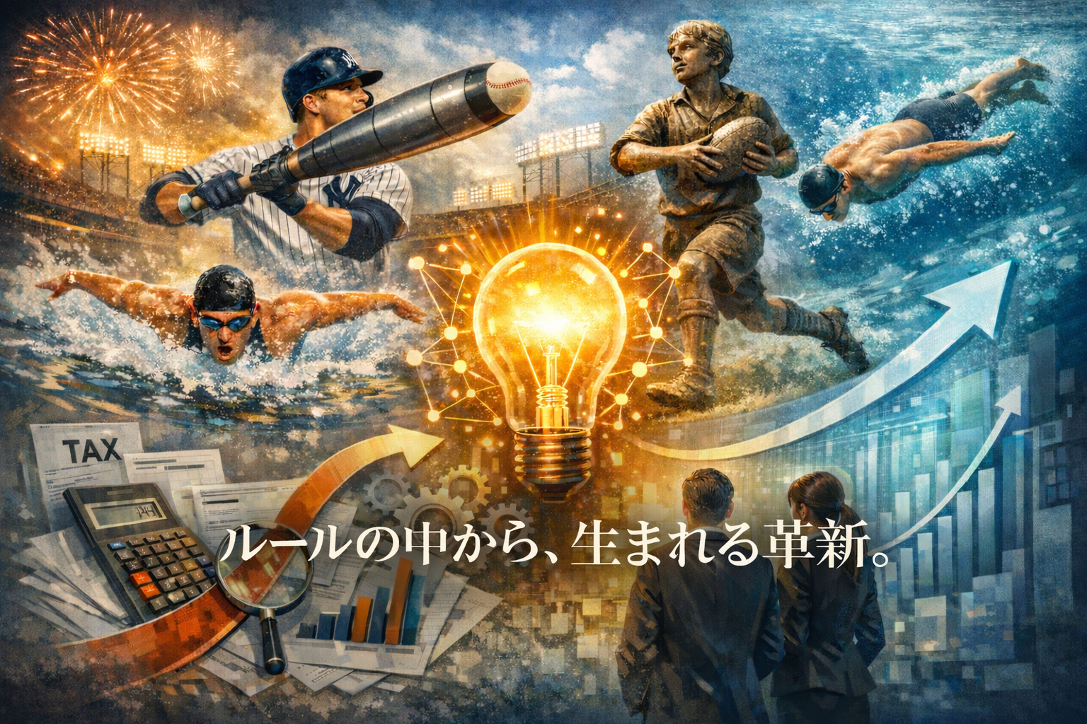 似たような話として水泳競技のバタフライが挙げられると思います。かつて平泳ぎのルールは、左右対称の動きをすること、というものだったそうですが、この平泳ぎの競技中にエーリッヒ・ラーデマッヒェルというドイツ人選手が、腕を水面から上げて泳ぐ独自のスタイルを披露。それが現在のバタフライへとつながっていきました。ルール内での発明により新しい競技を生み出すという、まさにゲームチェンジを起こした事例です。ちなみに、今のドルフィンキックを最初に取り入れたのは日本人選手だったそうです。