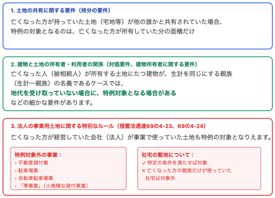 このほか、特定同族会社事業用宅地等のように法人の事業に利用されていた宅地等や、法人の社宅など居住用の敷地についても、小規模宅地等の特例の適用範囲が細かく定められています。